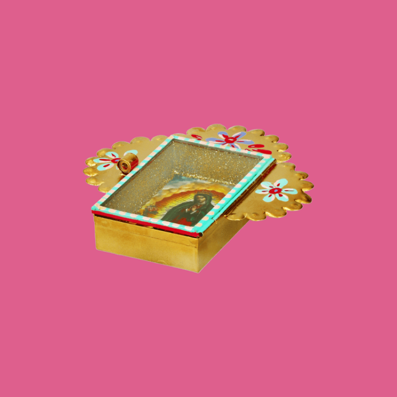 3D wall decorative shrine of Virgen de Guadalupe with floral design. The glass window can be opened to express your prayers to Mary. Fully hand painted and internally embellished with shiny glitters.