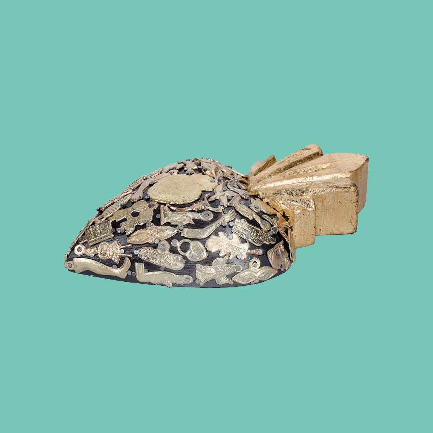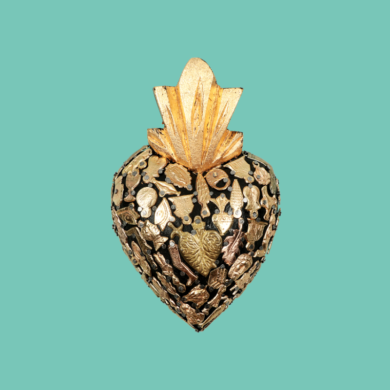 Decorazione da parete con cuore fiammeggiante in 3D, completamente adornata da ciondoli devozionali Milagros placcati in oro o argento, applicati manualmente e inchiodati alla base in legno. Ex Voto - Amuleti Portafortuna.
