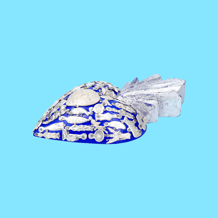 Decorazione da parete con cuore fiammeggiante in 3D, completamente adornata da ciondoli devozionali Milagros placcati in oro o argento, applicati manualmente e inchiodati alla base in legno. Ex Voto - Amuleti Portafortuna.
