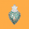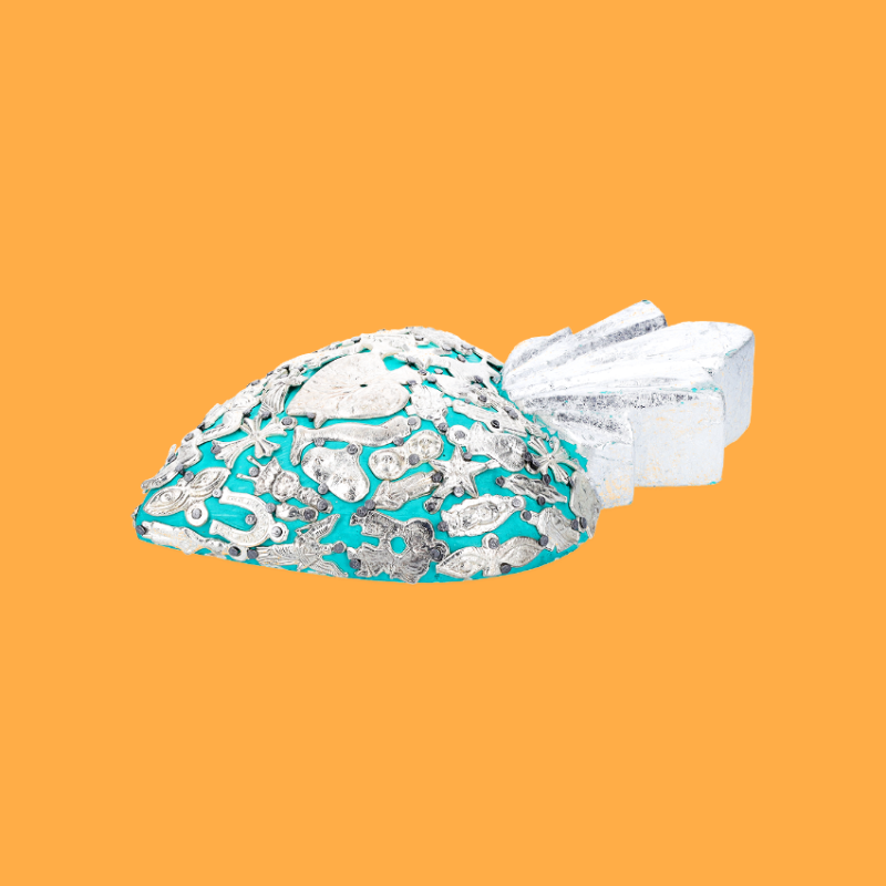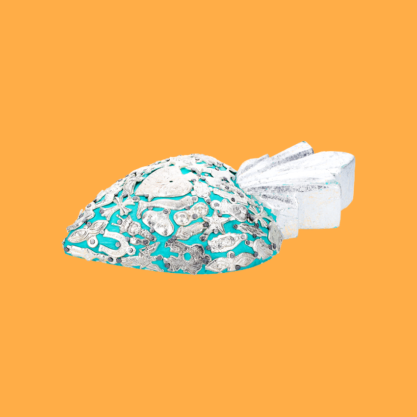 Decorazione da parete con cuore fiammeggiante in 3D, completamente adornata da ciondoli devozionali Milagros placcati in oro o argento, applicati manualmente e inchiodati alla base in legno. Ex Voto - Amuleti Portafortuna.