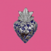 Mini decorazione murale a cuore fiammeggiante in 3D, completamente adornata da ciondoli devozionali Milagros placcati in oro o argento, applicati manualmente e inchiodati alla base in legno. Ex Voto - Amuleti Portafortuna.