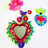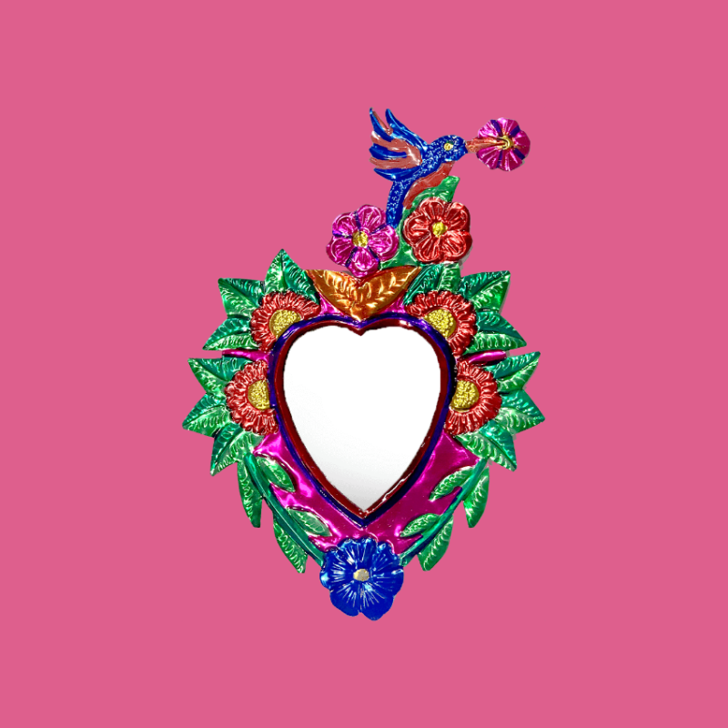 Specchio decorativo da parete a forma di cuore, punzonato in bassorilievo, circondato da una cornice di natura fiorita e da un colibrí in volo sulla parte superiore. Il colibrí è un colorato amante della vita: simboleggia gioia, libertà e capacità di superare le difficoltà. Ex Voto - Amuleti Portafortuna.