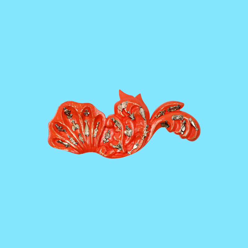 Decorazione da parete a forma di conchiglia in 3D che simboleggia l'elemento "Acqua", scolpita a mano e impreziosita da ciondoli devozionali Milagros unici nel loro genere, applicati manualmente e inchiodati alla base di legno. Ogni pezzo è unico. Ex Votos - Amuleti Portafortuna.