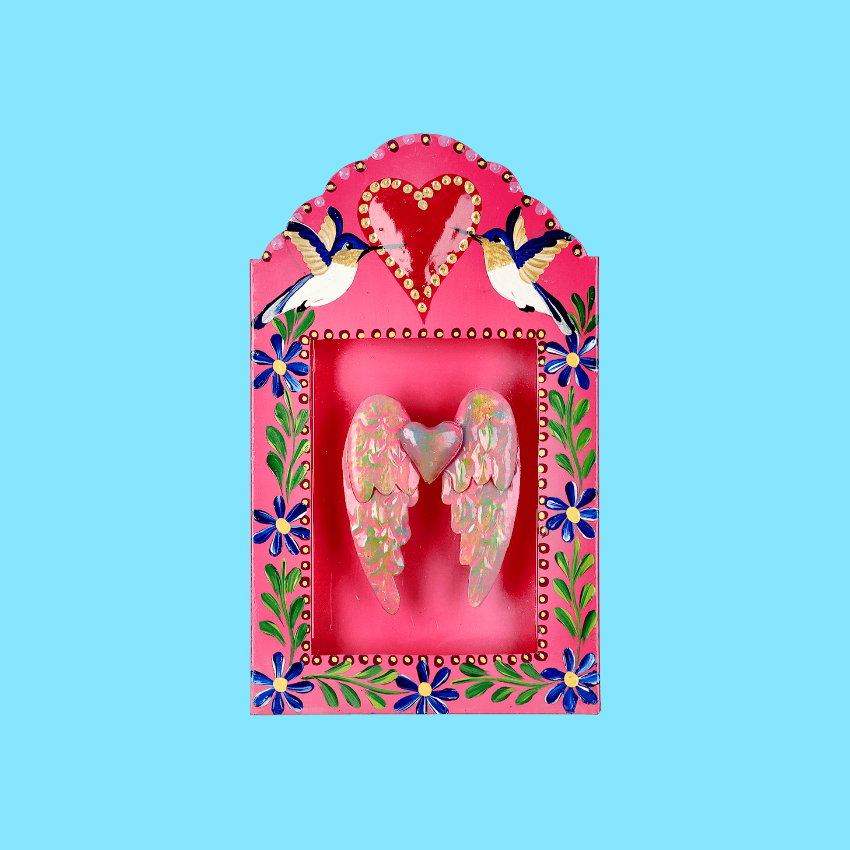 Cornice decorativa da parete 3D extra-large con cuore alato centrale. Dipinta a mano con un disegno floreale sui lati e un colibrí volante sulla parte superiore, questa cornice è un omaggio alla libertà e alla vita. Il colibrí simboleggia la gioia, la libertà e la capacità di superare le difficoltà. Lo stile è senza finestra di vetro.