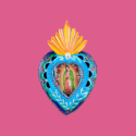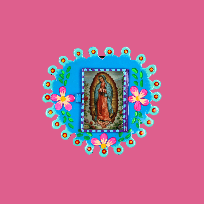 Teca decorativa da parete arrotondata in 3D della Virgen de Guadalupe con disegno floreale. La finestra di vetro può essere aperta per esprimere le proprie preghiere a Maria. Completamente dipinto a mano e impreziosito internamente da brillantini.