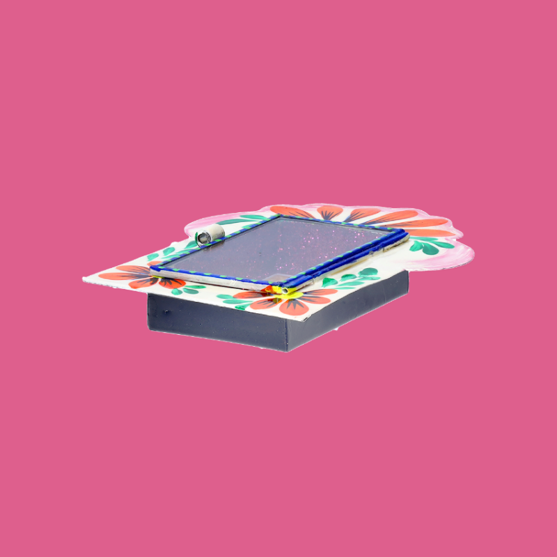 Teca decorativa da parete in 3D della Virgen de Guadalupe con disegno floreale multicolore. La finestra di vetro può essere aperta per esprimere le proprie preghiere a Maria. Completamente dipinto a mano e impreziosito internamente da brillantini.