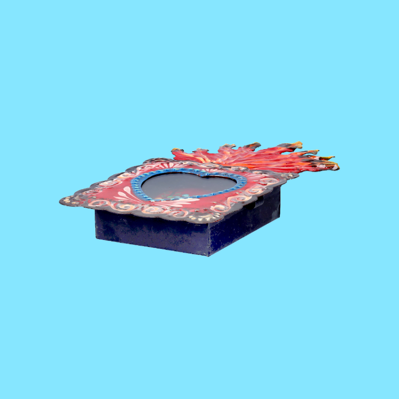 Teca decorativa da parete 3D quadrata della Virgen de Guadalupe con maxi fiamma. La vetrata può essere aperta per esprimere le proprie preghiere a Maria. Completamente dipinto a mano, questo stile è particolarmente speciale per l'ulteriore miniatura interna decorata.