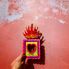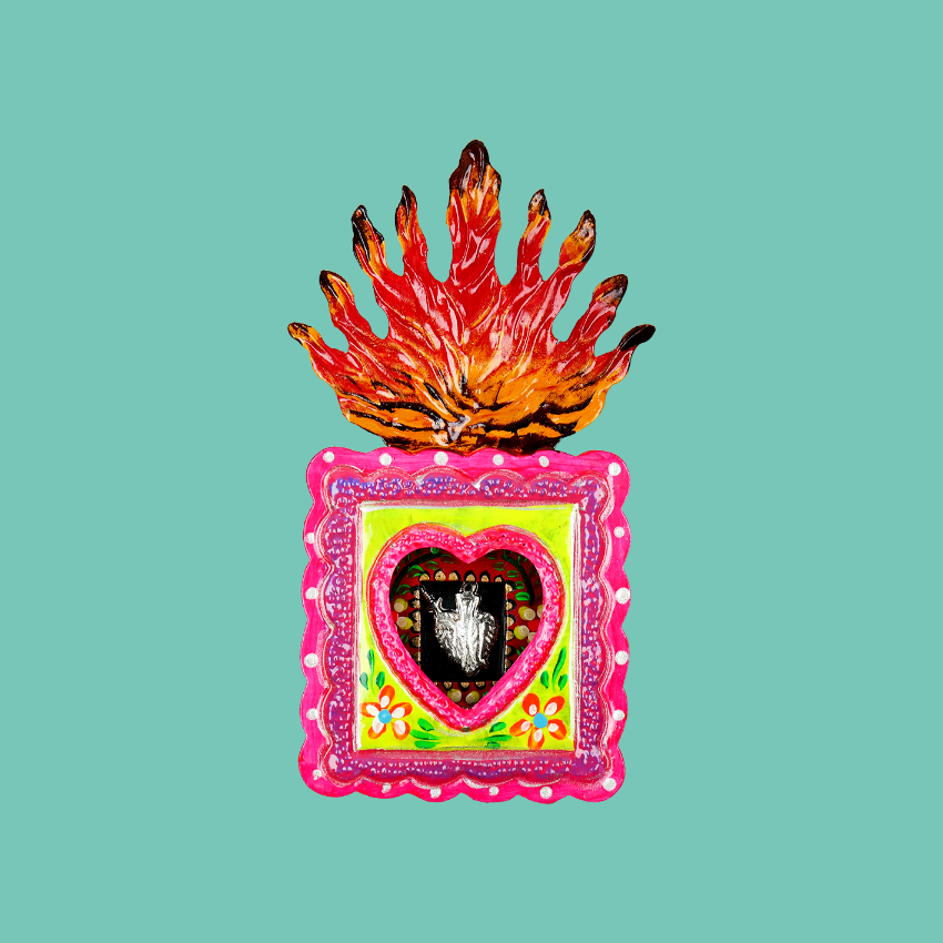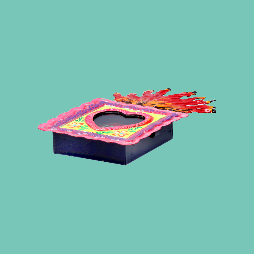 Teca devozionale da parete quadrata in 3D con maxi fiamma e charm Milagros interno. La finestra di vetro può essere aperta per esprimere le proprie preghiere. Completamente dipinto a mano, questo stile è particolarmente speciale per l'ulteriore miniatura interna decorata.