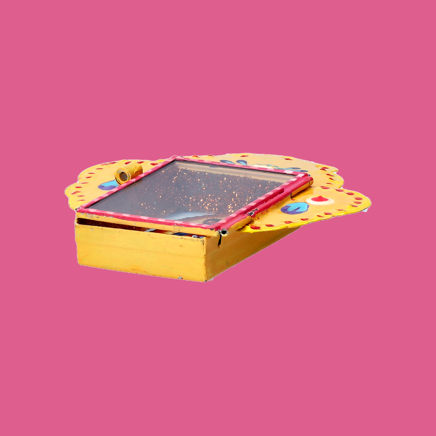 Piccola teca decorativa da parete in 3D della Virgen de Guadalupe. La vetrata può essere aperta per esprimere le proprie preghiere a Maria. Completamente dipinto a mano e impreziosito internamente da brillantini.