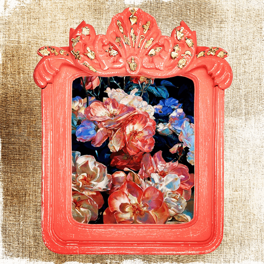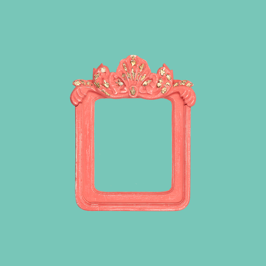 Cornice decorativa intagliata a mano con dettaglio centrale a forma di conchiglia, impreziosita da ciondoli devozionali Milagros unici applicati sulla parte superiore. Base rimovibile inclusa. Si tratta di un'opera d'arte polivalente: può essere una pura decorazione da parete, una cornice o uno specchio da parete, su richiesta. Si prega di considerare che è possibile una piccola variazione del colore. Ogni pezzo è unico.