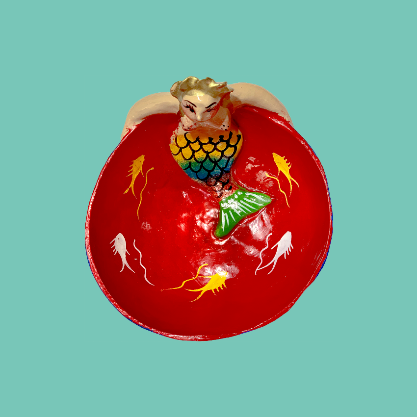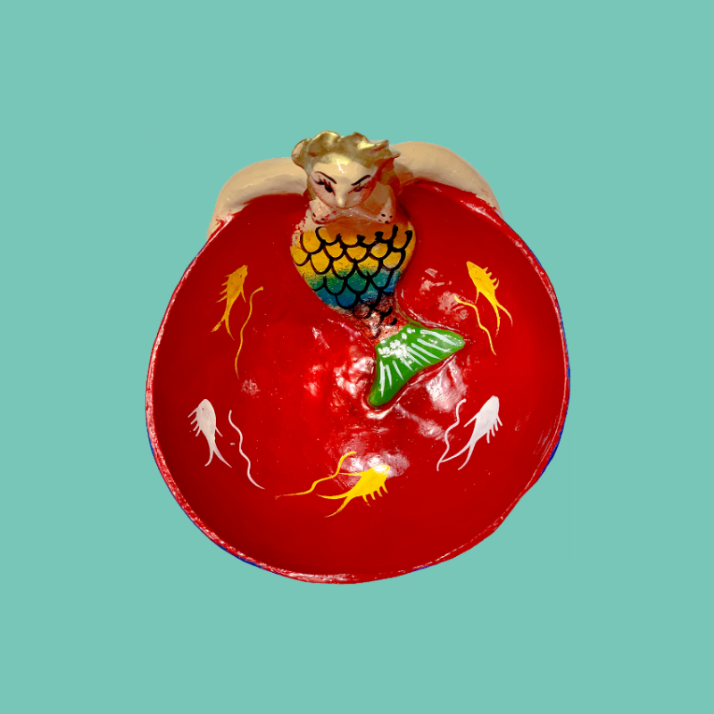 Ciotola decorativa in cocco dipinta a mano con sirena in argilla e simboli marini. La sirena rappresenta bellezza, femminilità e sensualità. Oggetto multiuso: svuota tasche, portagioie, ciotola per cibo secco o... usa la tua creatività!