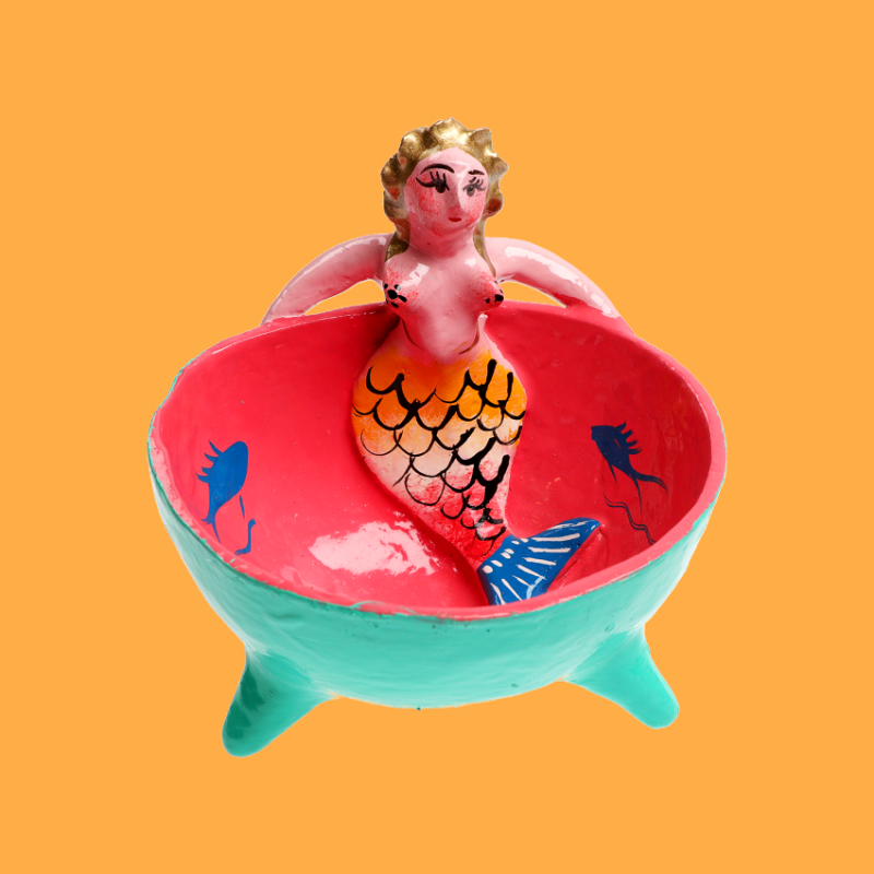 Ciotola decorativa in cocco dipinta a mano con sirena in argilla e simboli marini. La sirena rappresenta bellezza, femminilità e sensualità. Oggetto multiuso: svuota tasche, portagioie, ciotola per cibo secco o... usa la tua creatività!