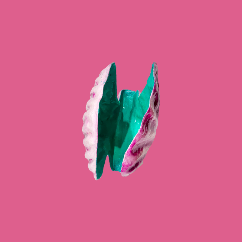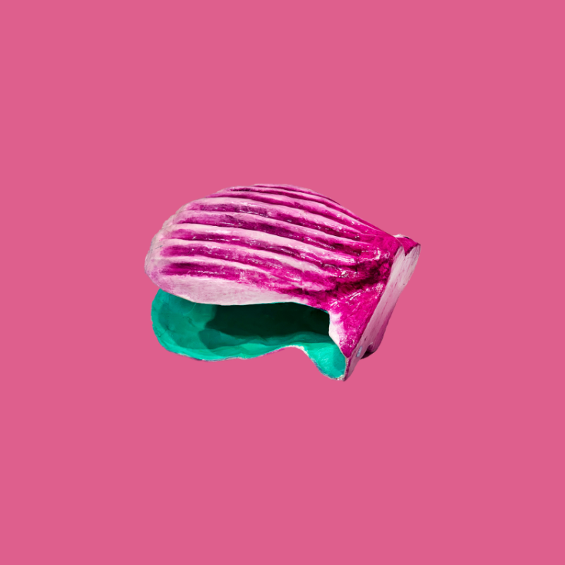 Conchiglia decorativa smerlata in cartapesta dipinta a mano con colori straordinari. Oggetto multiuso: vaso per fiori, portadocumenti o puro ornamento. Ogni pezzo è unico.