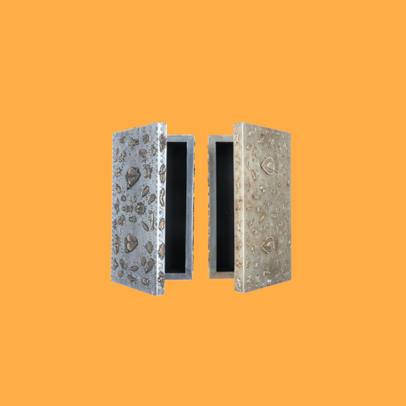 Scatola decorativa in legno intagliato a mano, ricoperta da uno strato di metallo e impreziosita da ciondoli devozionali Milagros in oro o argento, unici nel loro genere. Perfetta per rendere unico qualsiasi angolo della casa, contenente preziosi e gioielli, ma usate la vostra creatività per trovare il posto giusto. Può essere ottimo anche per nascondere i dispositivi nel vostro salotto! Ogni pezzo è unico.