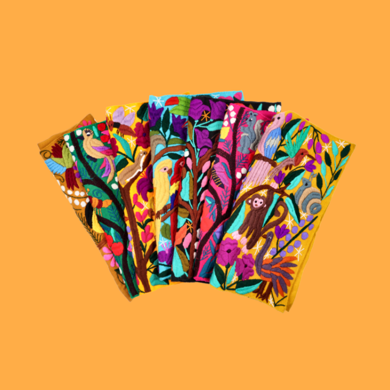 Cuscino quadrato ricamato a mano foderato su un lato e decorato con animali tropicali e natura, da una giungla ideale. Gli artigiani del Chiapas hanno mescolato estratti di frutta, piante e fiori ottenendo i colori per tingere i filati. Nessun cuscino all'interno. Lavare a mano o a secco.