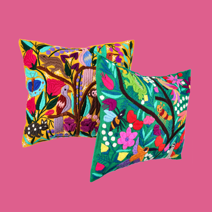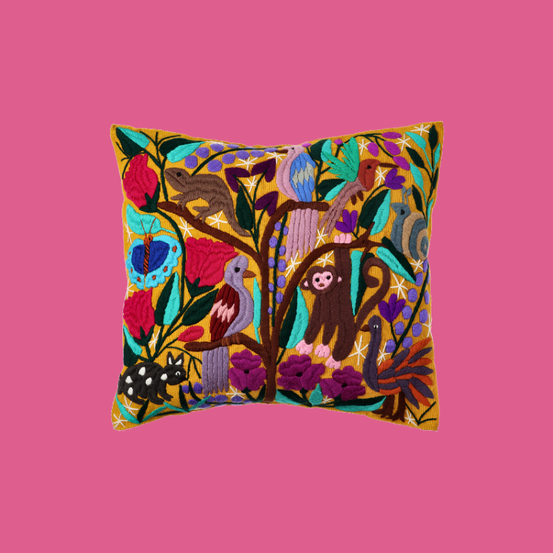 Cuscino quadrato ricamato a mano foderato su un lato e decorato con animali tropicali e natura, da una giungla ideale. Gli artigiani del Chiapas hanno mescolato estratti di frutta, piante e fiori ottenendo i colori per tingere i filati. Nessun cuscino all'interno. Lavare a mano o a secco.