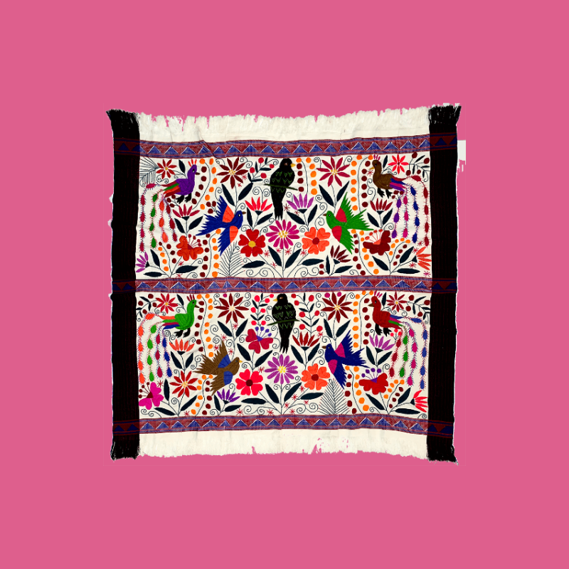 Arazzo multicolore extra-large ricamato a mano e decorato con animali tropicali e natura, da una giungla ideale. Gli artigiani del Chiapas usano mescolare estratti di frutta, piante e fiori, ottenendo i colori per tingere i filati. Ogni arazzo può essere utilizzato in molti modi diversi: come decorazione murale, tovaglia, copriletto o divano, tappeto, coperta... basta trovare l'uso più adatto! Ogni pezzo è realizzato a telaio. Lavare a mano o a secco.
