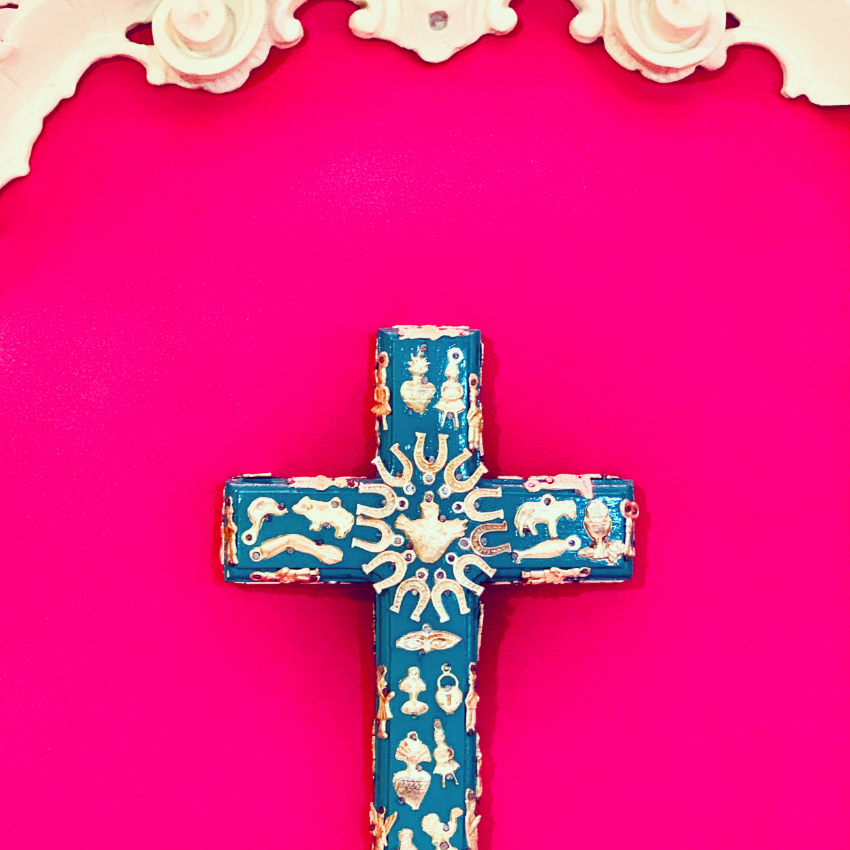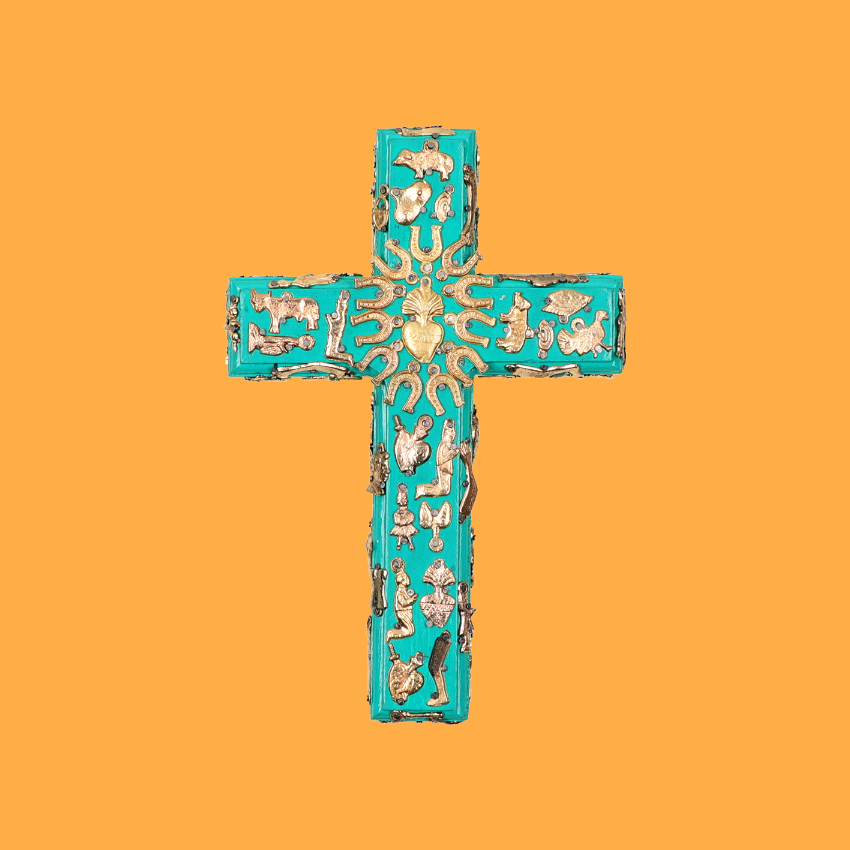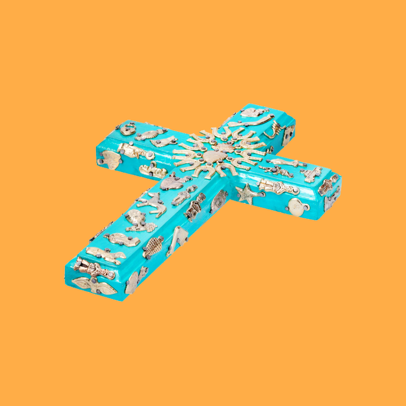 Decorazione murale 3D a forma di croce, impreziosita dall'applicazione di ciondoli devozionali Milagros unici nel loro genere. La croce è un simbolo cosmico potente, che rappresenta il cerchio delle energie della natura: collega la terra al cielo e l'ovest all'est. Un prezioso amuleto per proteggere il vostro luogo. Ogni pezzo è unico. Ex Votos - Amuleti Portafortuna.