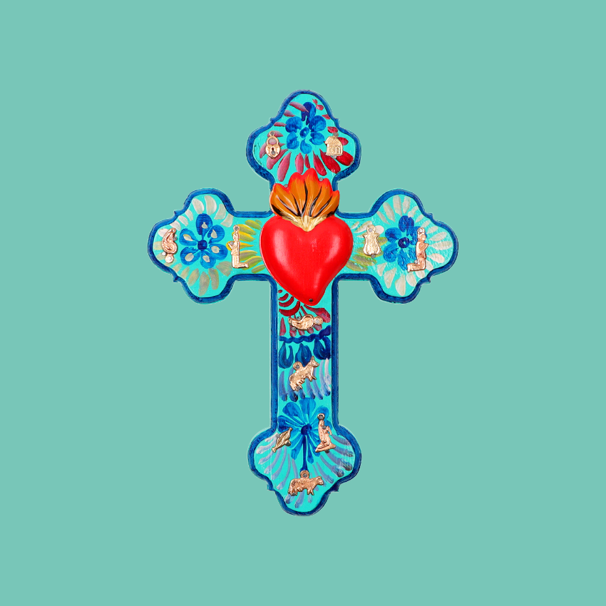 Decorazione murale 3D a forma di croce con cuore centrale fiammeggiante, impreziosita da un disegno floreale dipinto a mano e da ciondoli devozionali Milagros unici applicati. La croce è un simbolo cosmico potente, che rappresenta il cerchio delle energie della natura: collega la terra al cielo e l'ovest all'est. Un prezioso amuleto per proteggere il vostro luogo. Ogni pezzo è unico. Ex Votos - Amuleti Portafortuna.