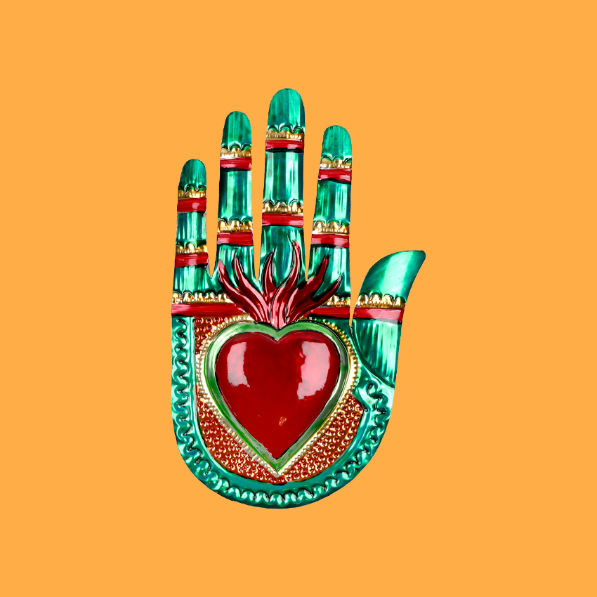 Decorazione murale lucida multicolore a forma di mano con cuore centrale, punzonato in bassorilievo. La mano è ampiamente considerata simbolo di carità ed empatia: significa "dal cuore". In diverse culture, mettere una mano sulla porta di casa significa protezione e buona fortuna. Ex Votos - Amuleti Portafortuna.