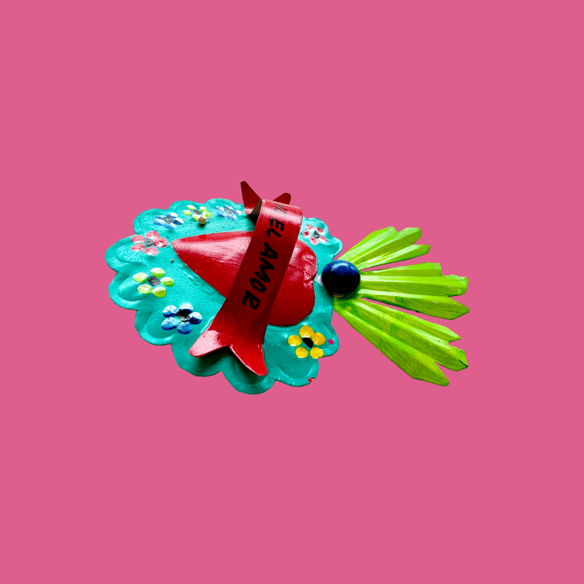 Decorazione da parete a forma di cuore multicolore con frase spagnola "Que Viva El Amor" e disegno folk. L'oggetto vuole celebrare tutte le forme dell'amore, della luce e dei pensieri positivi. Ex Voto - Amuleti Portafortuna.