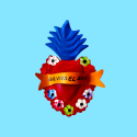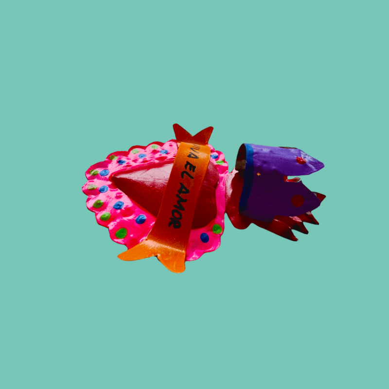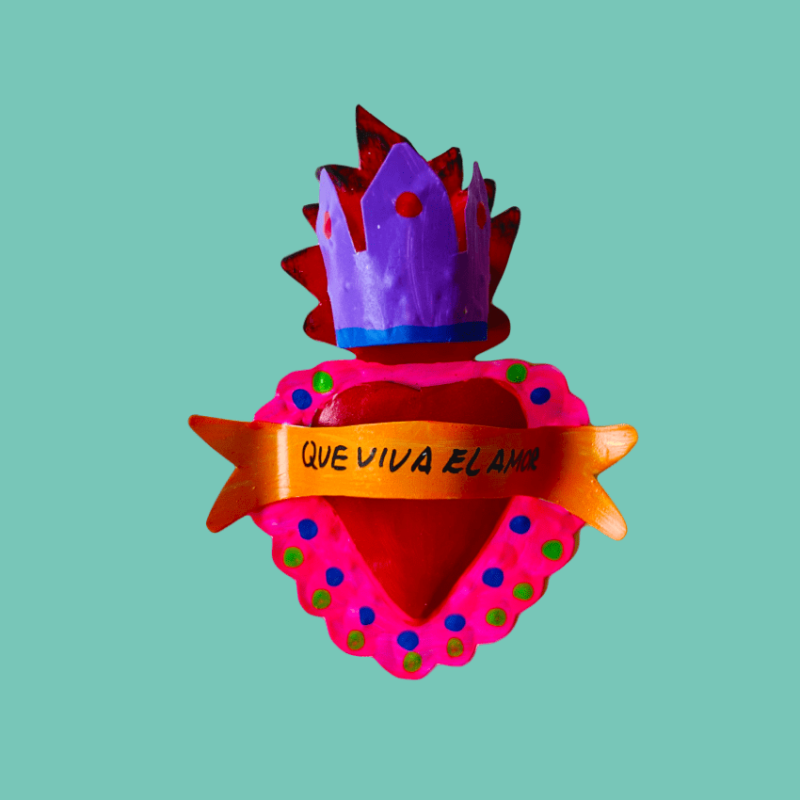 Decorazione da parete a forma di cuore multicolore con frase spagnola "Que Viva El Amor" e disegno folk. L'oggetto vuole celebrare tutte le forme dell'amore, della luce e dei pensieri positivi. Ex Voto - Amuleti Portafortuna.
