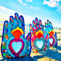 Decorazione murale a forma di mano con disegno floreale completo e specchio centrale a forma di cuore fiammeggiante. La mano è ampiamente considerata simbolo di carità ed empatia. Significa "dal cuore". Ex Votos - Amuleti Portafortuna.