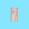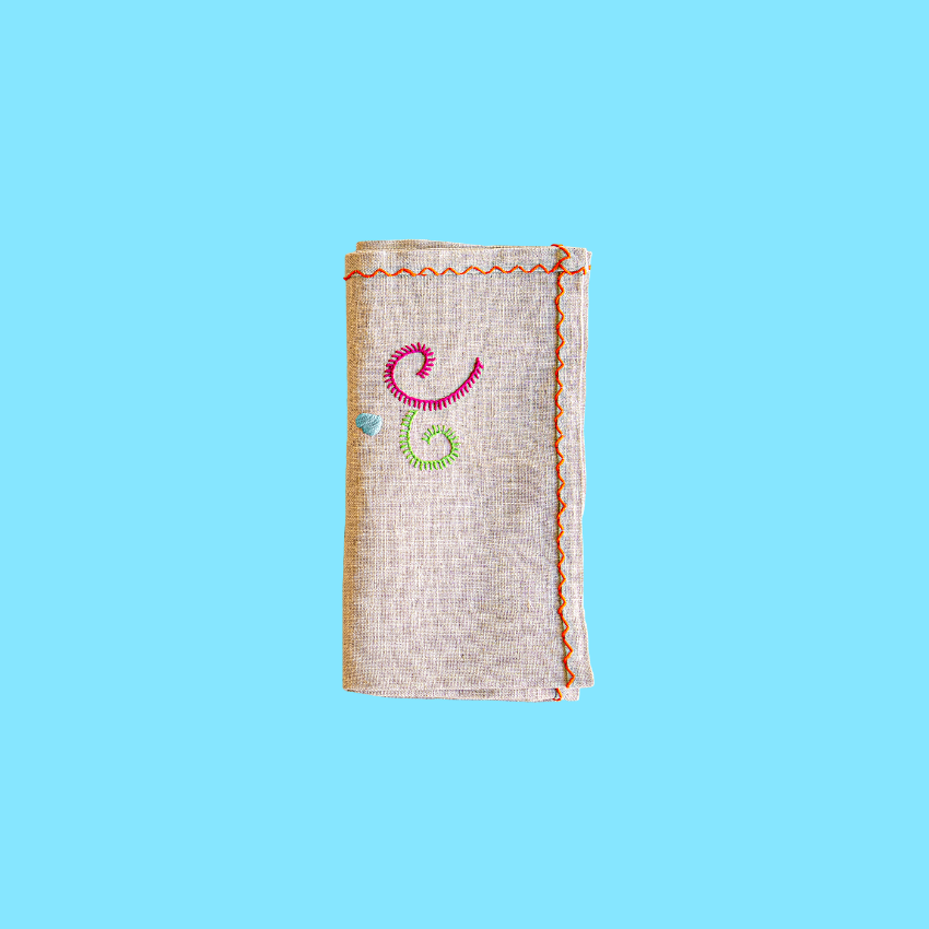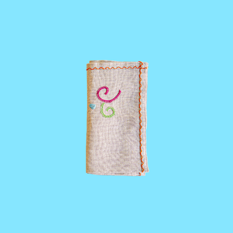 Tovagliolo in lino naturale con disegno multicolore e dettaglio a forma di cuore realizzato a mano in Portogallo.